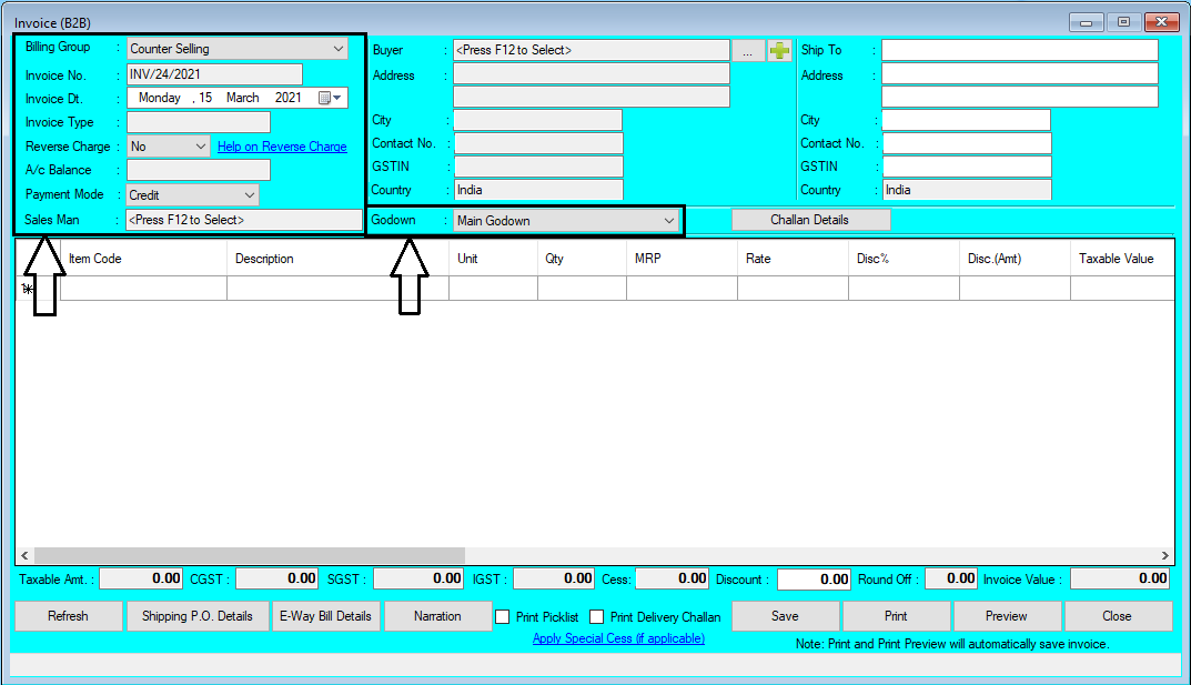 - Buyers: Press "F12" Key to Open Buyers List, Select/Double Click to Select Particular Buyers for Invoice B2B Billing, as shown in below image