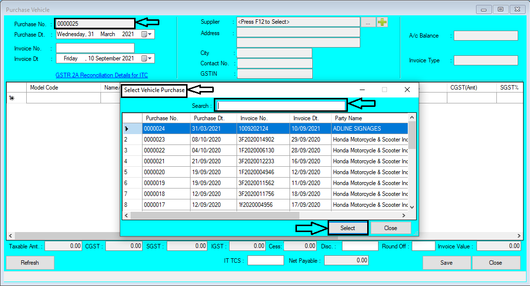 - Press "F12" key on Purchase Number to Open Previous Purchase Invoice List, Select/Double-Click to Open Particular bill in Modify Mode, as shown in below image